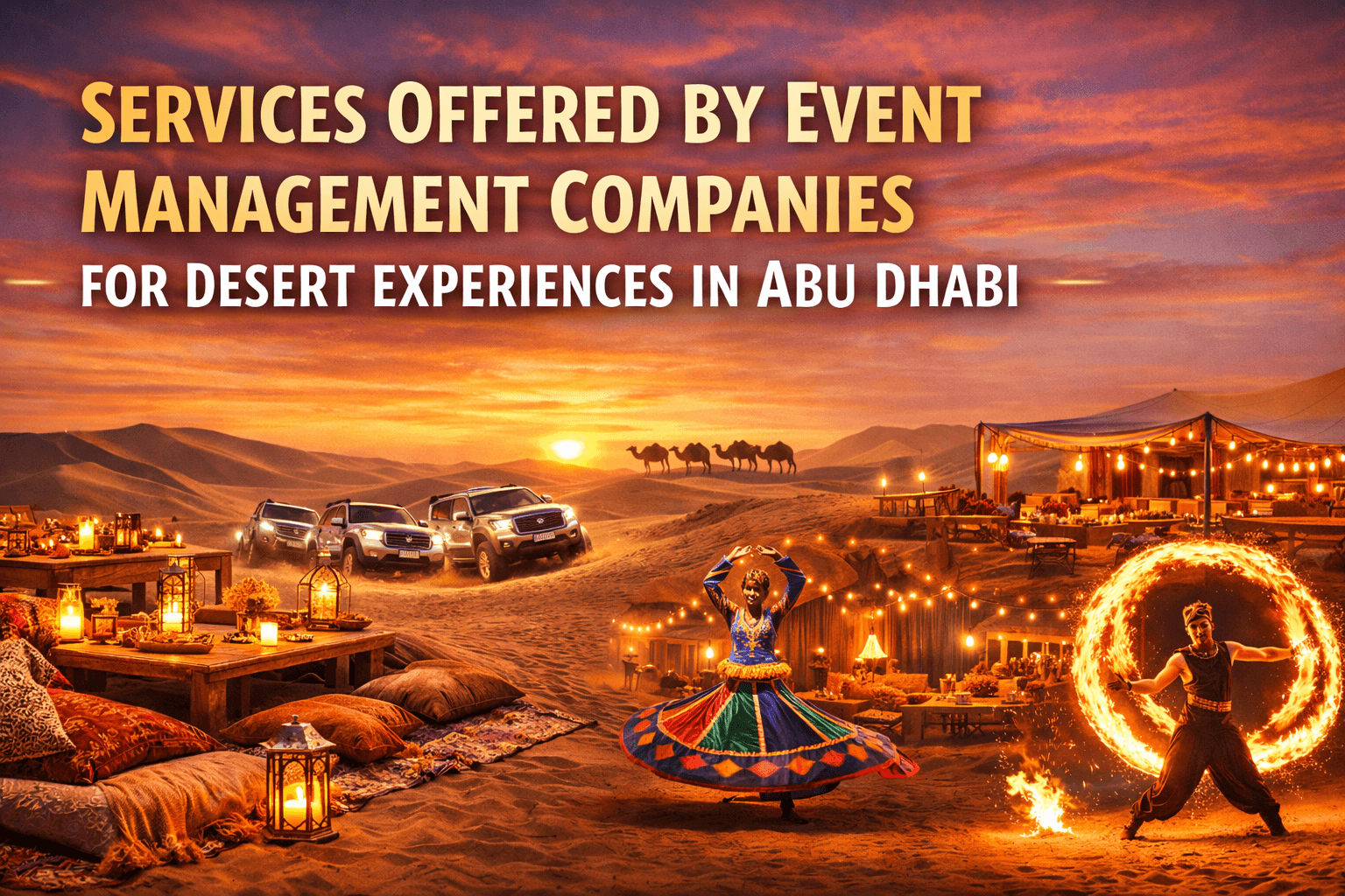Our packages can include event setups, desert safari camps, sunset lounges, cultural and traditional performances, catering and food arrangements, camel rides, vanity vans, staffing, and souvenir stalls. Packages can be fully customized.